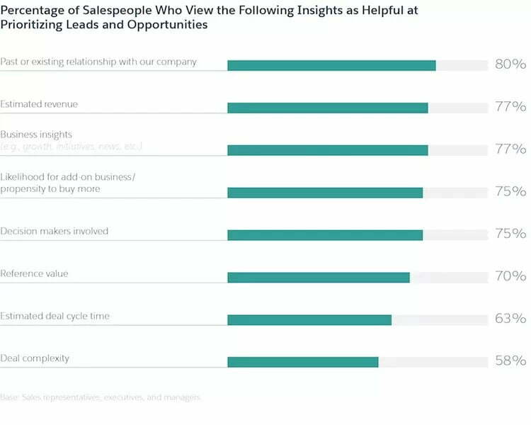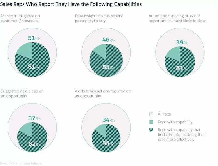 Just 46% of sales reps get insights on customers’ inclination to purchase. In any case, of those reps, 85% state this makes them progressively efficient in their activity. Also, only 34% of reps get alerts to crucial activities required to propel a sales opportunity; however, 85% of them state these cautions make them progressively successful.